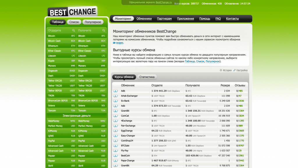Bestchange — Крупнейший русскоязычный сервис мониторинга, необходимый каждому, кто работает с цифровыми активами. Платформа аккумулирует данные о сотнях онлайн-обменников, позволяя за секунды найти самый выгодный курс для пары Рубль/Биткоин, Доллар/USDT и сотен других направлений.