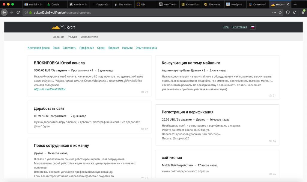 Yukon – Специализированная фриланс-платформа, ориентированная на рынок специфических услуг, которые запрещены или ограничены на классических биржах. Здесь встречаются заказчики и исполнители, ценящие приватность превыше всего. Спектр задач огромен: от поиска специалистов по аудиту безопасности (пентестеров) и восстановлению доступов к аккаунтам до запросов на нестандартный маркетинг и PR-кампании в социальных сетях.